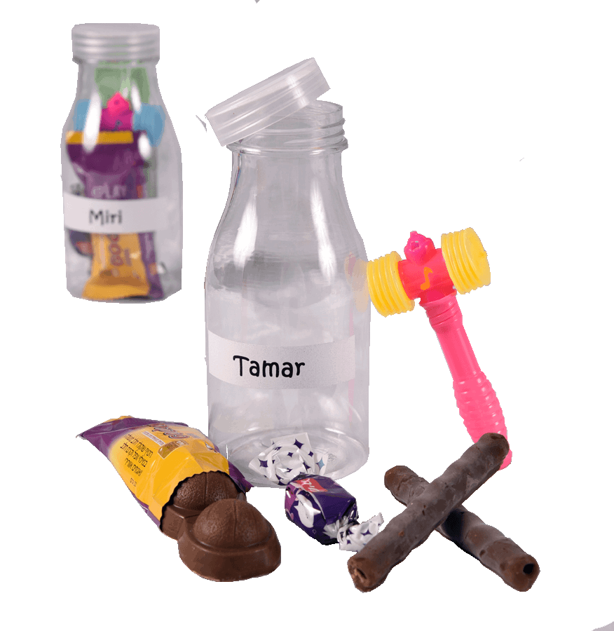 A charming addition to any Purim Pak mishloach manot, each personalized Mini comes in a covered plastic bottle almost 6 inches high, and contains chocolate covered wafer rolls, a soft jelly candy, a Purim noisemaker, and a mini chocolate candy bar.